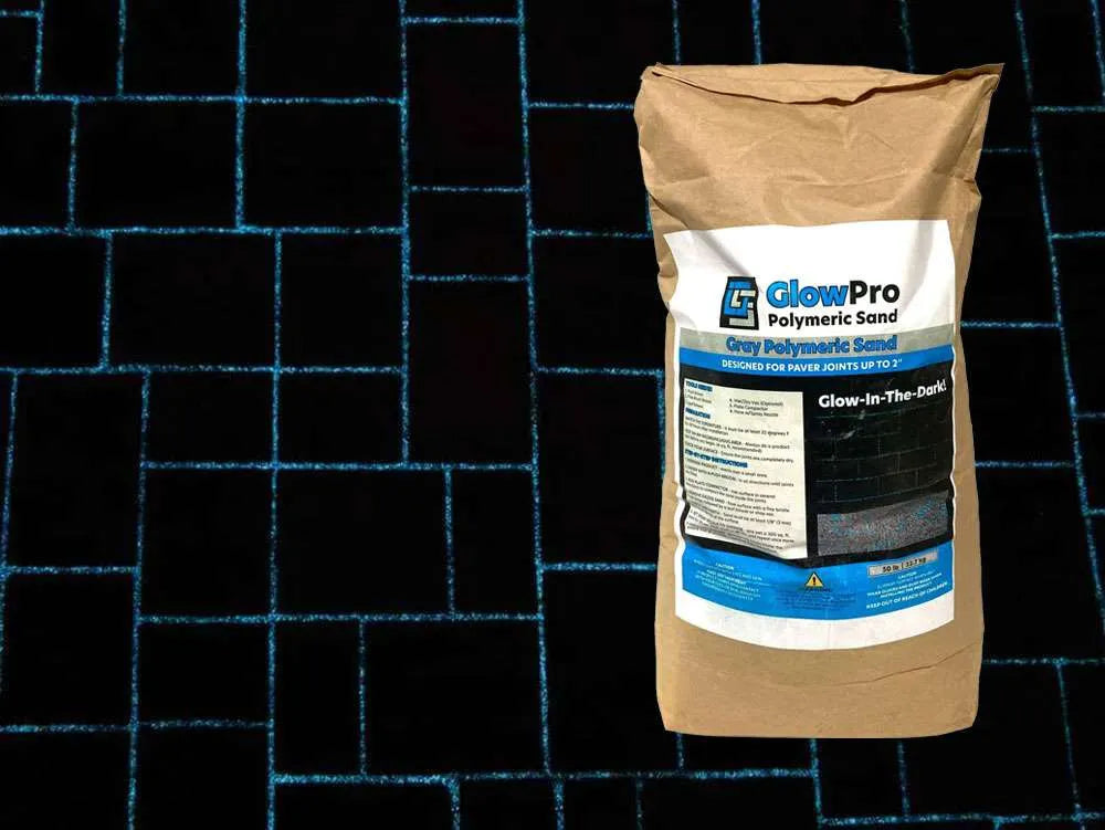 Much Like the stones that store the energy from the sun’s UV rays to produce a Glow between the joints of your pavers. Recommend a minimum of 1/8 of an inch with our Pre-mixed polymeric. Glow Sand is available in Aqua, Emerald and Sky.